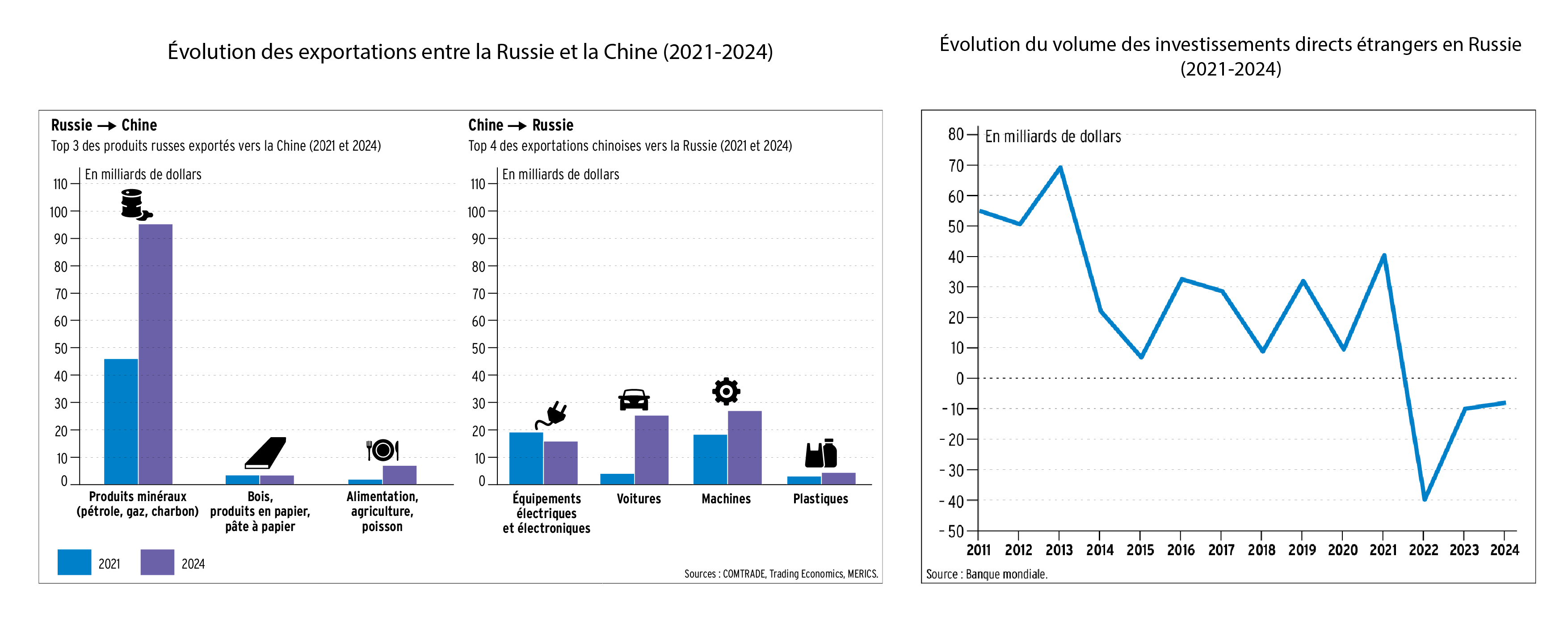 1) En dépit des sanctions sans précédent imposées à la Russie, sa situation macroéconomique semblait à première vue rétablie durant la période 2022- 2024 : la croissance du PIB atteignait 4,3 % en 2024, le recul du commerce avec les pays européens était compensé par une rapide augmentation de ses échanges commerciaux avec la Chine. Les prix élevés des matières premières, le contournement réussi des sanctions et une discipline budgétaire ont contribué à cette stabilité initiale.