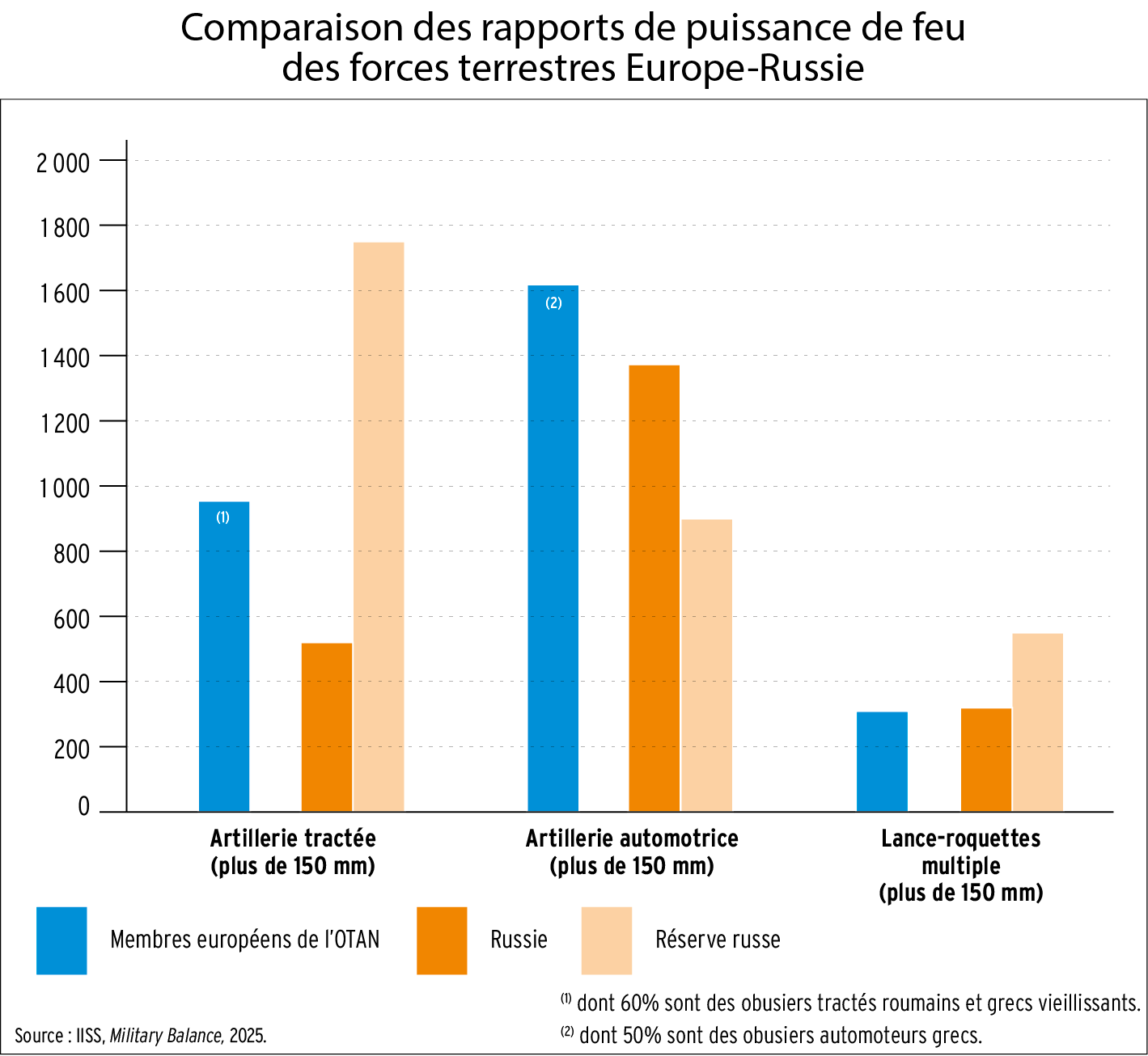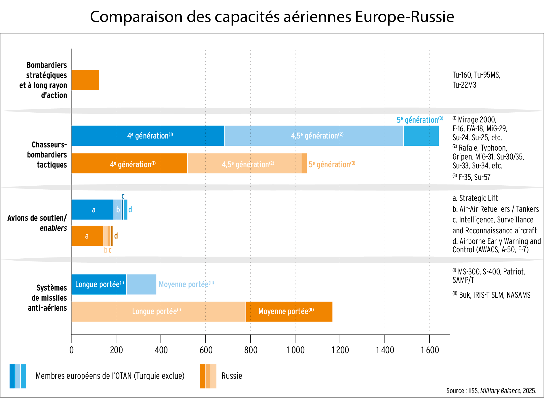 8) L’analyse du rapport de force montre que le domaine terrestre reste le point faible de l’Europe. Même si elle conserve un avantage qualitatif en matière d’entraînement, de commandement et de tactiques interarmes, la Russie possède un avantage décisif en termes de masse, de puissance de feu, de capacité de mobilisation et de tolérance à l’attrition. Dans le domaine aérien, l’Europe bénéficie d’une supériorité quantitative et qualitative nette. Sans soutien massif des États-Unis, le maintien de la supériorité aérienne européenne nécessiterait toutefois de combler les déficits en termes de stocks, de défense aérienne et antimissile intégrée et de capacités de neutralisation des défenses aériennes ennemies. En mer, dans l’espace et dans le cyberspace, l’Europe détient également l’avantage, à condition de l’exploiter en déplaçant la confrontation dans ces espaces, où la posture de déni russe se révèle moins efficace.