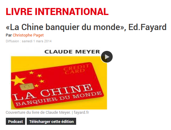 Cette semaine, le livre international est planétaire, puisqu’on va parler de La Chine banquier du monde. Qu’est-ce que la Chine achète, qu’est-ce que la Chine finance, d’où vient cet argent chinois qui semble inépuisable ? Réponses avec l’auteur de ce livre, Claude Meyer, docteur en économie, enseignant à Sciences Politiques.