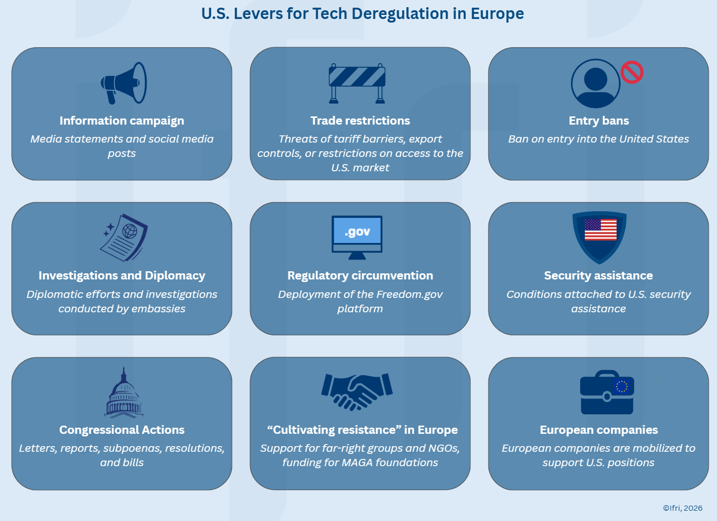 To undermine European regulatory frameworks, the administration has deployed a range of diplomatic, economic, and informational levers: embassy investigations, US entry bans, threats of tariffs, export controls, or market access restrictions, and social media campaigns... In line with the administration’s goal of “cultivating resistance,” this strategy also relies on European actors (such as far-right lawmakers, businesses, or non-governmental organizations).
