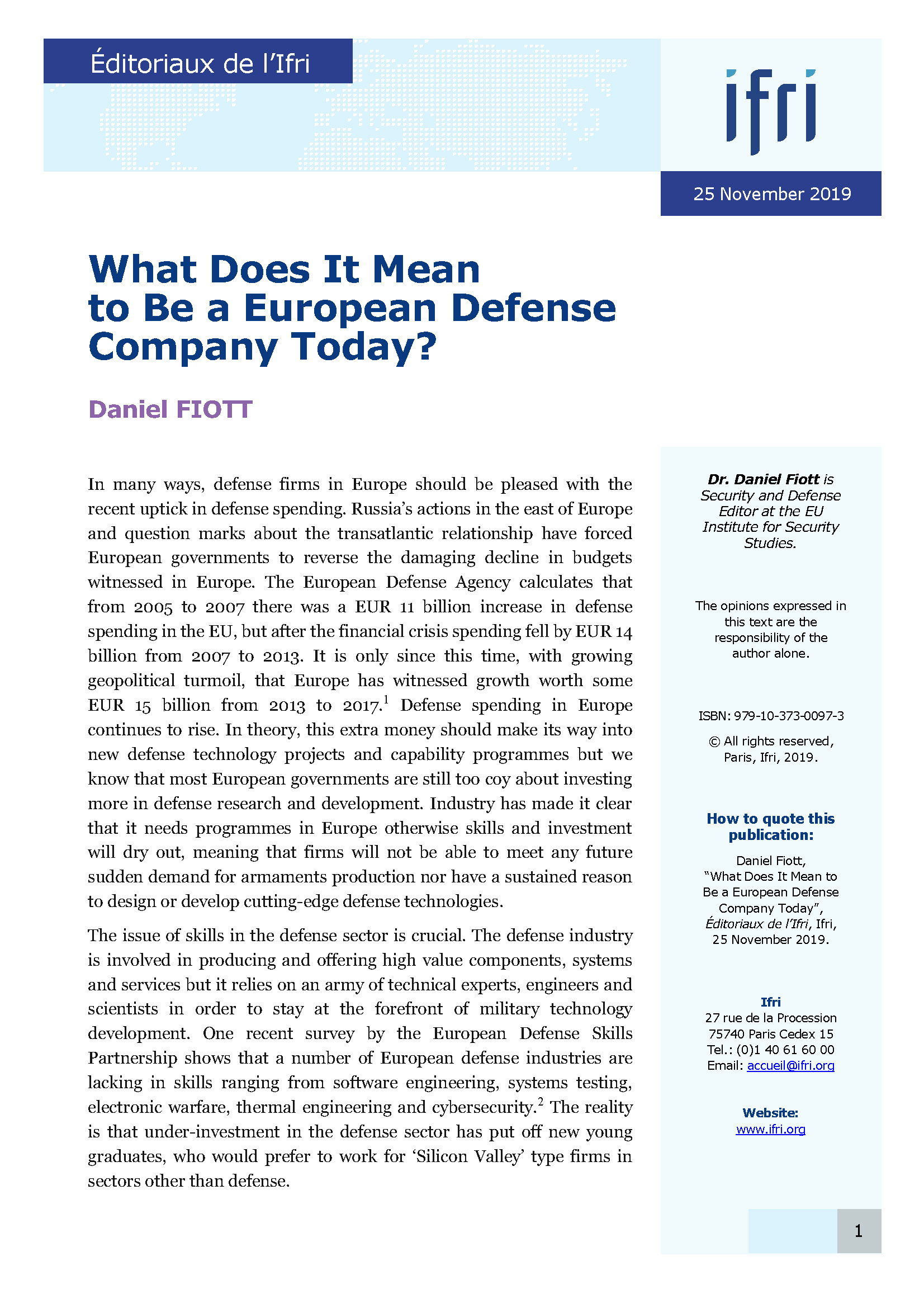 Après deux décennies marquées par de faibles investissements, la remontée des budgets de défense en Europe et le lancement de nouvelles initiatives (Coopération structurée permanente et Fonds européen de défense en particulier) laissent penser que le tabou sur l'utilisation de fonds européens dans le domaine de la défense est tombé, ouvrant de nouvelles opportunités. Là où des réticences existent chez certains responsables politiques européens face à l'ambition européenne d'une plus grande autonomie stratégique, les industriels du continent ont mesuré l'ampleur des enjeux en termes de préservation des savoir-faire et de compétitivité.