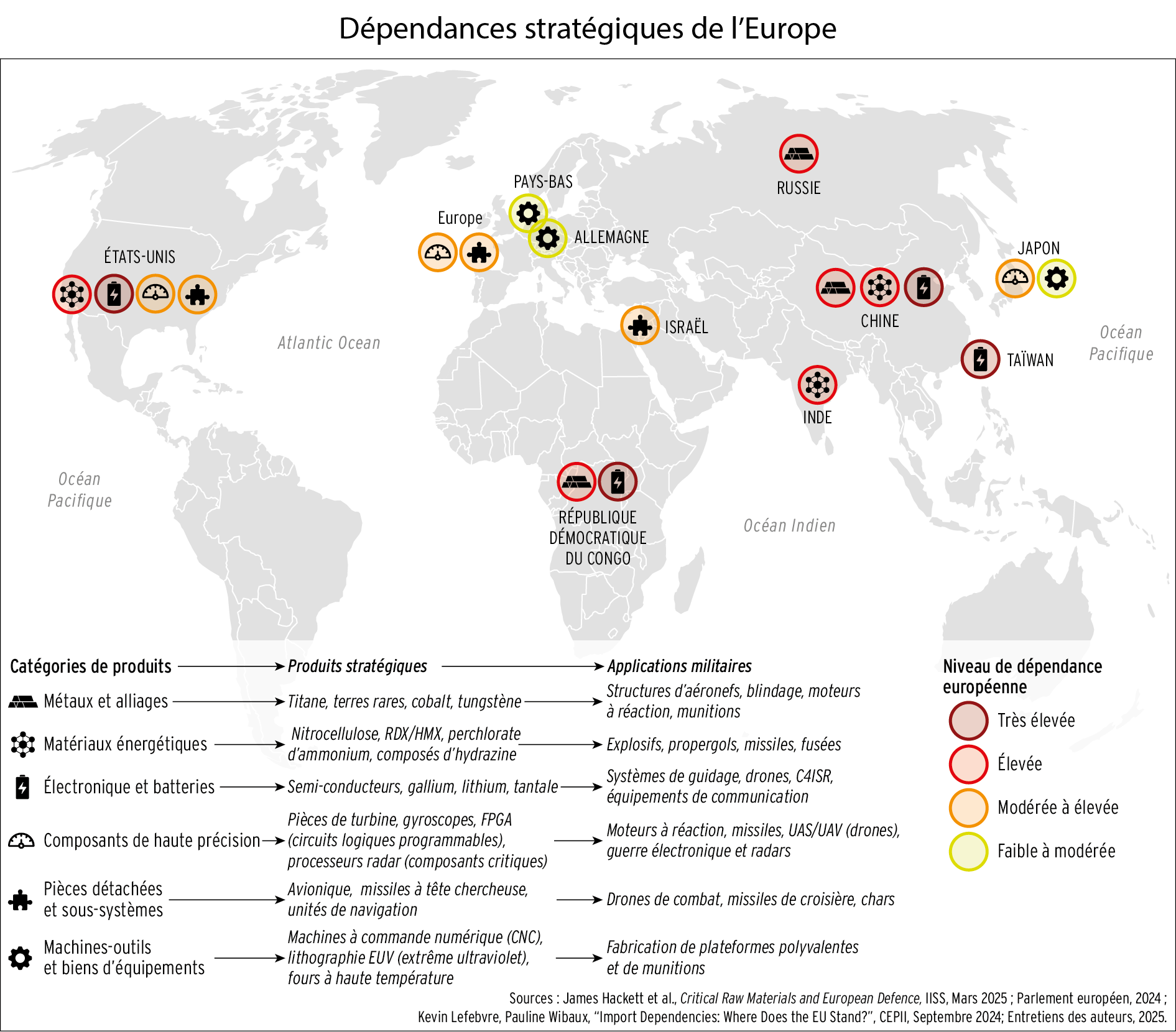 16) La Russie dispose d’un réseau international dont le coeur est composé de partenariats bilatéraux avec des régimes anti-occidentaux : l’Iran et la Corée du Nord lui fournissent des équipements militaires cruciaux, tandis que la Chine demeure son principal soutien politique et économique. De nombreux pays facilitateurs l’aident à contourner les sanctions et elle a de multiples sympathisants dans le « Sud global » et en Europe même (Hongrie, Slovaquie). Cependant, beaucoup de ces relations sont transactionnelles et fragiles.