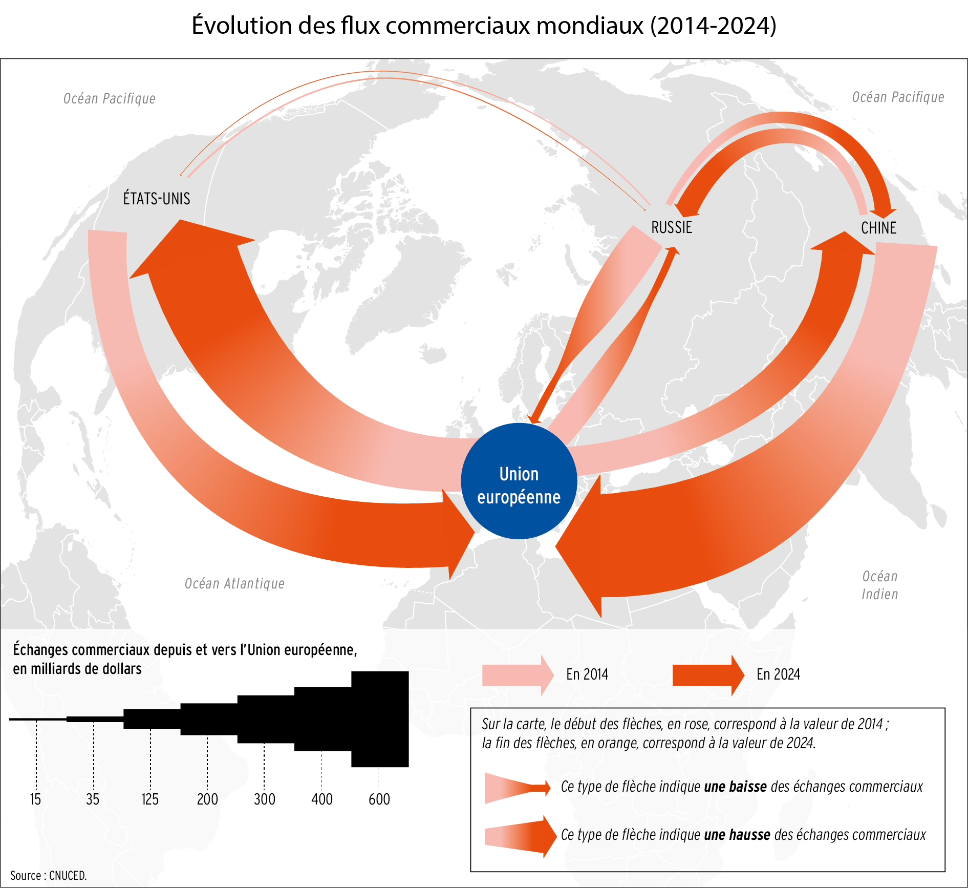 10) L’Europe aimante tous les flux. Si son « arrière stratégique » est plus diversifié en raison de son intégration dans l’économie mondiale, il est aussi plus exposé. Tandis que l’Europe dépend fortement de chaînes d’approvisionnement vulnérables aux risques géopolitiques et d’un soutien transatlantique plus incertain, la Russie s’appuie sur un « axe » anti-occidental qui se découple rapidement des circuits contrôlés par l’Occident.